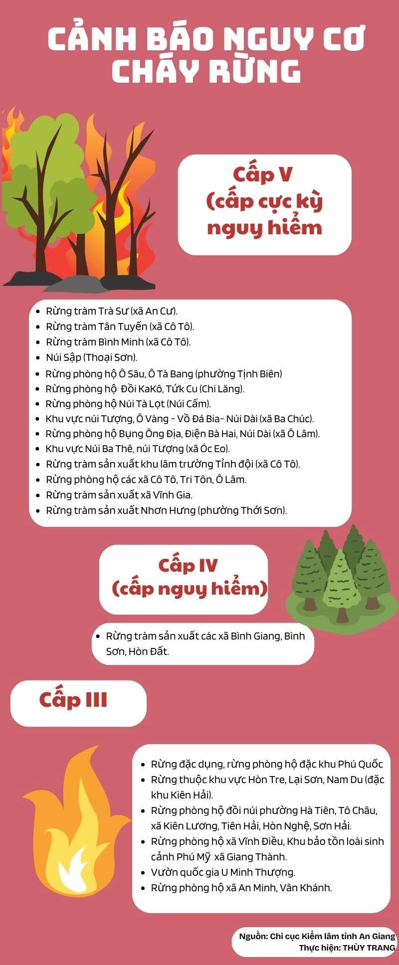 - Chi cục Kiểm lâm tỉnh An Giang đã ban hành thông báo cấp dự báo cháy rừng trên địa bàn tỉnh. Nhiều khu vực được xác định ở cấp nguy hiểm đến cực kỳ nguy hiểm. Các ngành, địa phương và người dân cần nâng cao cảnh giác, chủ động triển khai các biện pháp phòng cháy, chữa cháy rừng, hạn chế thấp nhất thiệt hại có thể xảy ra.