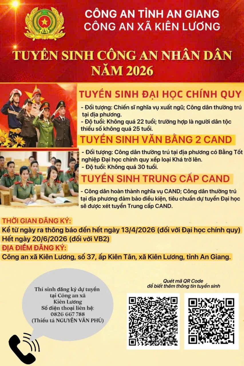 aA Thông báo Thông báo tuyển sinh CÔNG AN NHÂN DÂN năm 2026 27/03/2026, 13:09 Thông báo tuyển sinh CÔNG AN NHÂN DÂN năm 2026 Quét mã QR để biết thêm chi tiết! Quay về Chia sẻ Copy link thành công Tin khác Lịch làm việc của Chủ tịch và các Phó Chủ tịch UBND xã Kiên Lương (Từ ngày 06/4/2026 đến ngày 10/4/2026) Lịch làm việc Thông báo 06/04/2026 An Giang cảnh báo nguy cơ cháy rừng Thông báo 03/04/2026 Lịch làm việc của Chủ tịch và các Phó Chủ tịch UBND xã Kiên Lương (30/3/2026 - 03/4/3026) Thông báo 29/03/2026 Lịch làm việc của Chủ tịch và các Phó Chủ tịch UBND huyện (từ ngày 16/5/2025 đến ngày 30/5/2025) Thông báo 25/09/2025 /thong-bao-tuyen-sinh-cong-an-nhan-dan-nam-2026